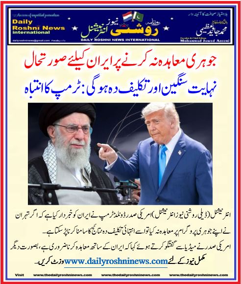 انٹرنیشنل (ڈیلی روشنی نیوز انٹرنیشنل )امریکی صدر ڈونلڈ ٹرمپ نے ایران کو خبردار کیا ہے کہ اگر تہران نے اپنے جوہری پروگرام پر معاہدہ نہ کیا تو اسے انتہائی تکلیف دہ نتائج کا سامنا کرنا پڑ سکتا ہے۔