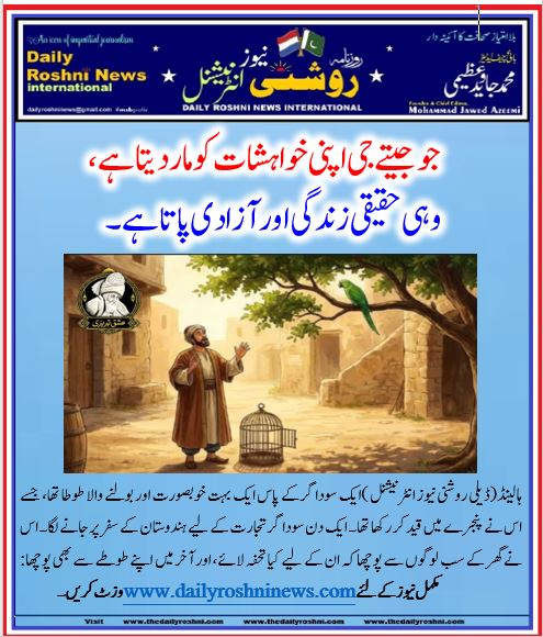 سبق: مولانا رومیؒ اس حکایت سے یہ درس دیتے ہیں کہ دنیا کی قید اور نفسانی خواہشات کے پنجرے سے حقیقی روحانی آزادی حاصل کرنے کے لیے انسان کو اپنی ‘انا’ اور نفسانی خواہشات کو مارنا پڑتا ہے۔ جو جیتے جی اپنی خواہشات کو مار دیتا ہے، وہی حقیقی زندگی اور آزادی پاتا ہے۔