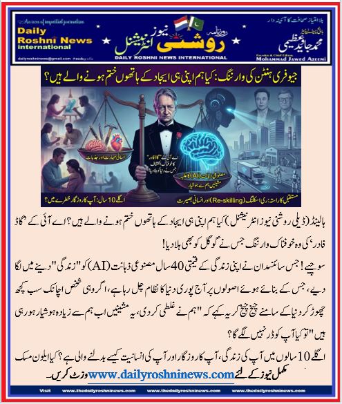 مصنوعی ذہانت کی دنیا پچھلے چند برسوں میں جس رفتار سے آگے بڑھی ہے، اس نے نہ صرف ٹیکنالوجی کے ماہرین کو چونکا دیا بلکہ پوری دنیا کی حکومتوں، صنعتوں اور عام افراد کو ایک ایسے سوال کے سامنے لا کھڑا کیا جو شاید انسانی تاریخ میں کبھی نہیں آیا تھا۔ سوال یہ ہے کہ کیا مشینیں صرف ہماری مددگار رہیں گی یا انسانوں کی جگہ لے لیں گی۔ اس بحث کا سب سے نمایاں چہرہ جیوفری ہنٹن ہیں جنہیں مصنوعی ذہانت کا گاڈ فادر کہا جاتا ہے۔ ان کی وارننگ محض ایک خیال نہیں بلکہ ایک ایسے مستقبل کی تصویر ہے جو آنے والے برسوں میں دنیا کی شکل بدل سکتا ہے۔