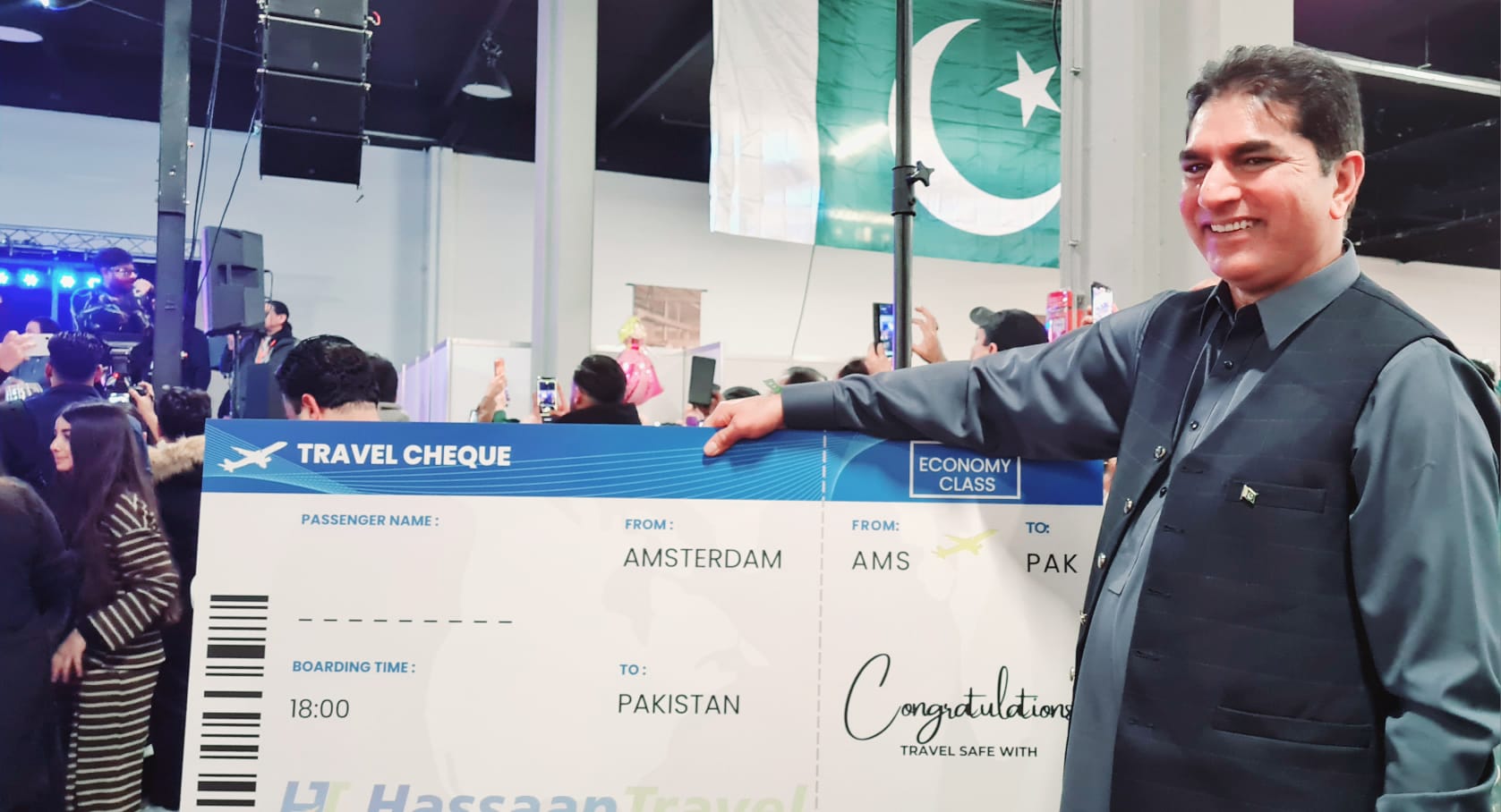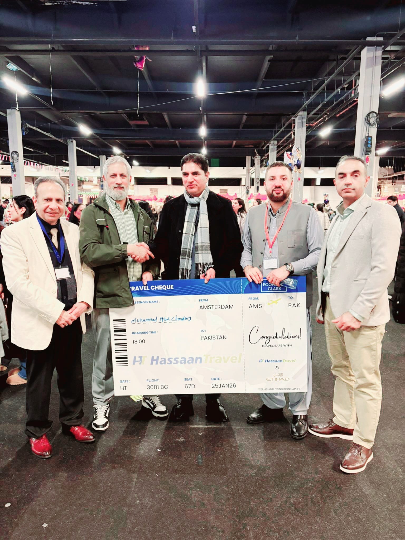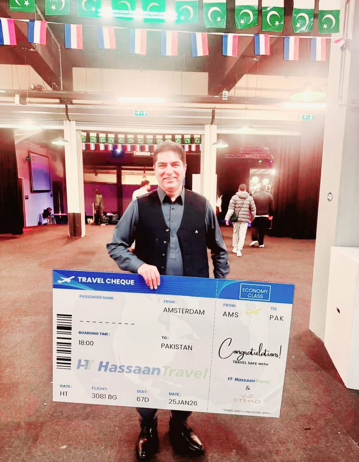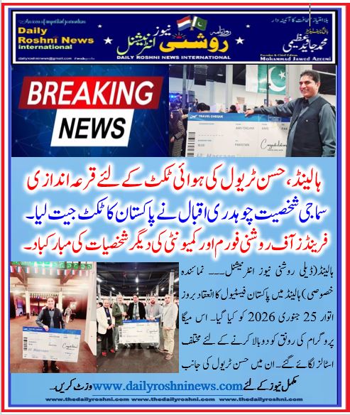 ہالینڈ(ڈیلی روشنی نیوز انٹرنیشنل۔۔۔ نمائندہ خصوصی ) ہالینڈ میں پاکستان فیسٹیول کا انعقاد بروز اتوار 25 جنوری 2026 کو کیا گیا۔ اس میگا پروگرام کی رونق کو دوبالا کرنے کے لئے مختلف اسٹالز لگائے گئے۔ ان میں حسن ٹریول کی جانب سے بھی اسٹال لگایا، مذکورہ ٹریول ایجنسی کے مالک حسن لطیف نے ایمسٹرڈیم سے پاکستان ریڑن ائیر ٹکٹ کی قرعہ اندازی کی جس کےنتیجے میں دی ہیگ کی معروف سماجی شخصیت اور فرینڈز آف روشن فورم کی ٹیم کے متحرک رکن چوہدری محمد اقبال قاضیاں کو پاکستان کے سفر کے لئے مفت ٹکٹ مل گیا ۔ پاکستانی میلے میں موجود فرینڈز آف روشنی فورم کے محمد جاوید عظیمی، میاں عاصم محمود، چوہدری بنارس علی ، چوہدری عمران چھپر اور کمیونٹی کی دیگر نمایاں شخصیات نےصمیم قلب سے مبارکباد پیش کرتے ہوئے دعائیہ کلمات بھی ادا کئے۔