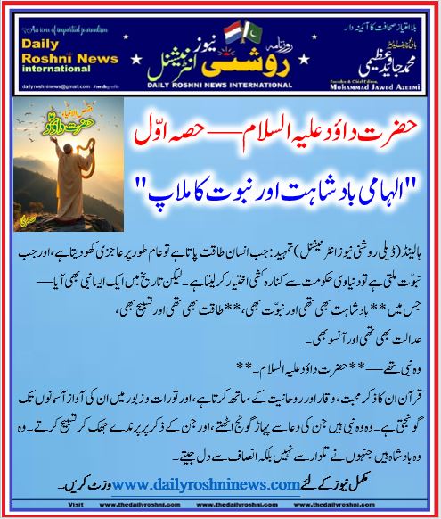ہالینڈ(ڈیلی روشنی نیوز انٹرنیشنل ) تمہید:جب انسان طاقت پاتا ہے تو عام طور پر عاجزی کھو دیتا ہے، اور جب نبوّت ملتی ہے تو دنیاوی حکومت سے کنارہ کشی اختیار کر لیتا ہے۔ لیکن تاریخ میں ایک ایسا نبی بھی آیا —