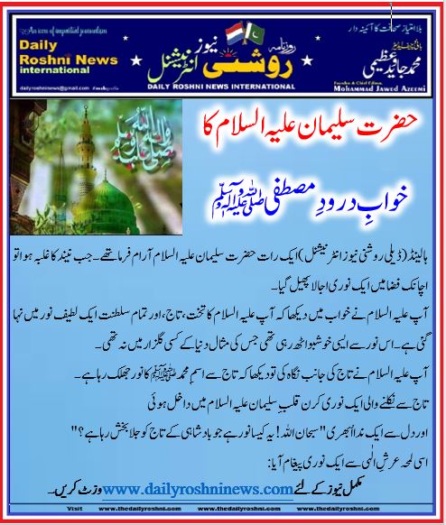 ہالینڈ(ڈیلی روشنی نیوز انٹرنیشنل )ایک رات حضرت سلیمان علیہ السلام آرام فرما تھے۔جب نیند کا غلبہ ہو اتو اچانک فضا میں ایک نوری اجالا پھیل گیا۔