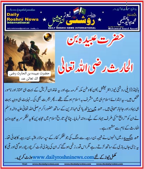 ہالینڈ(ڈیلی روشنی نیوز انٹرنیشنل )ان کا وطن مکہ مکرمہ ہے اور یہ خاندان قریش کے بہت ہی ممتاز اورنامور شخص ہیں۔ یہ ابتدائے اسلام ہی میں مشرف بہ اسلام ہوگئے تھے ۔ پھر ہجرت بھی کی ۔ نہایت ہی وجیہ بہت ہی بہادر اورجانبازصحابی ہیں ۔ ۲ھ میں ساٹھ یا اسّی مہاجرین کے ساتھ حضور اکرم صلی اللہ تعالیٰ علیہ والہ وسلم نے ان کو ”رابغ” کی طرف جہاد کے لیے روانہ فرمایا۔ چنانچہ تاریخ اسلام میں مجاہدین کا یہ لشکر سریہ عبیدہ بن الحارث کے نام سے مشہور ہے۔
