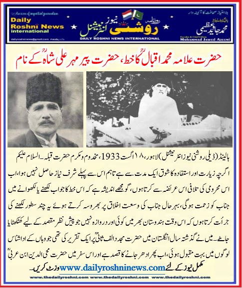 حضرت علامہ محمد اقبالؒ کا خط، حضرت پیر مہر علی شاہ ؒ کے نام