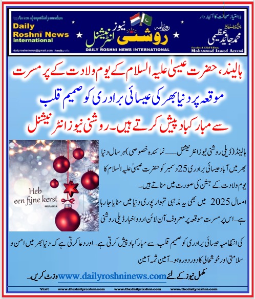 ہالینڈ(ڈیلی روشنی نیوز انٹرنیشنل ۔۔۔نمائندہ خصوصی)ہر سال دنیا بھر میں آباد عیسائی برادری 25 دسمبر کو حضرت عیسیٰ علیہ السلام کا یوم ولادت کے جشن کی صورت میں مناتے ہیں۔