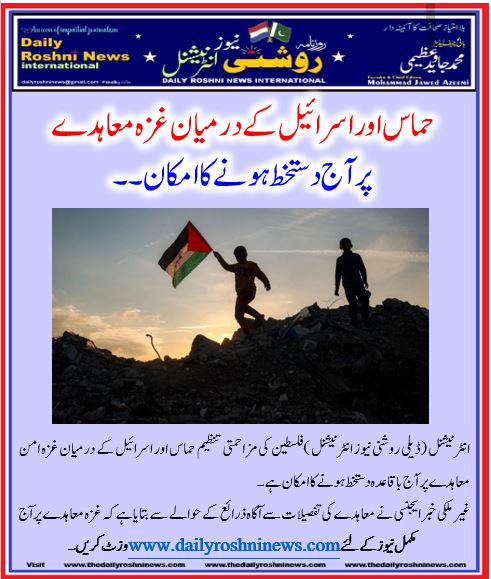 پاکستان(ڈیلی روشنی نیوز انٹرنیشنل )فلسطین کی مزاحمتی تنظیم حماس اور اسرائیل کے درمیان غزہ امن معاہدے پر آج باقاعدہ دستخط ہونے کا امکان ہے۔