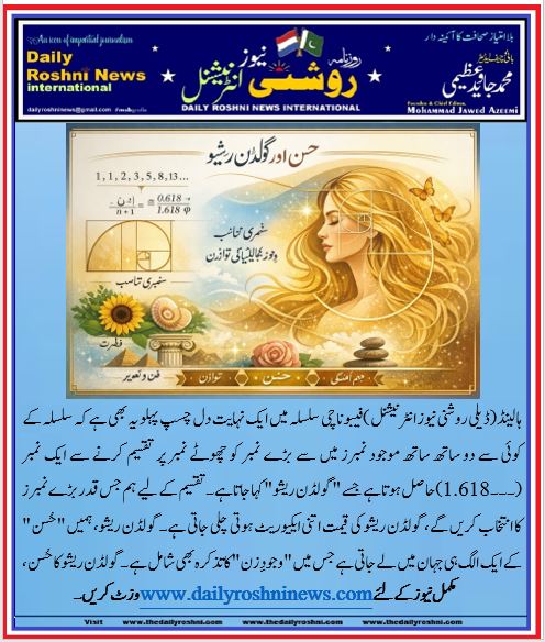 ہالینڈ(ڈیلی روشنی نیوز انٹرنیشنل )فیبوناچی سلسلہ میں ایک نہایت دل چسپ پہلو یہ بھی ہے کہ سلسلہ کے کوئی سے دو ساتھ ساتھ موجود نمبرز میں سے بڑے نمبر کو چھوٹے نمبر پر تقسیم کرنے سے ایک نمبر (۔۔۔1.618) حاصل ہوتا ہے جسے “گولڈن ریشو” کہا جاتا ہے۔ تقسیم کے لیے ہم جس قدر بڑے نمبرز کا انتخاب کریں گے، گولڈن ریشو کی قیمت اتنی ایکیوریٹ ہوتی چلی جاتی ہے۔ گولڈن ریشو، ہمیں “حُسن” کے ایک الگ ہی جہان میں لے جاتی ہے جس میں “وجودِ زن” کا تذکرہ بھی شامل ہے۔ گولڈن ریشو کا حُسن، توازن کا حُسن ہے۔ اس کا تعلق کسی ایک شے سے نہیں، بلکہ توازن (Balance) سے ہے۔ یہ تناسب: