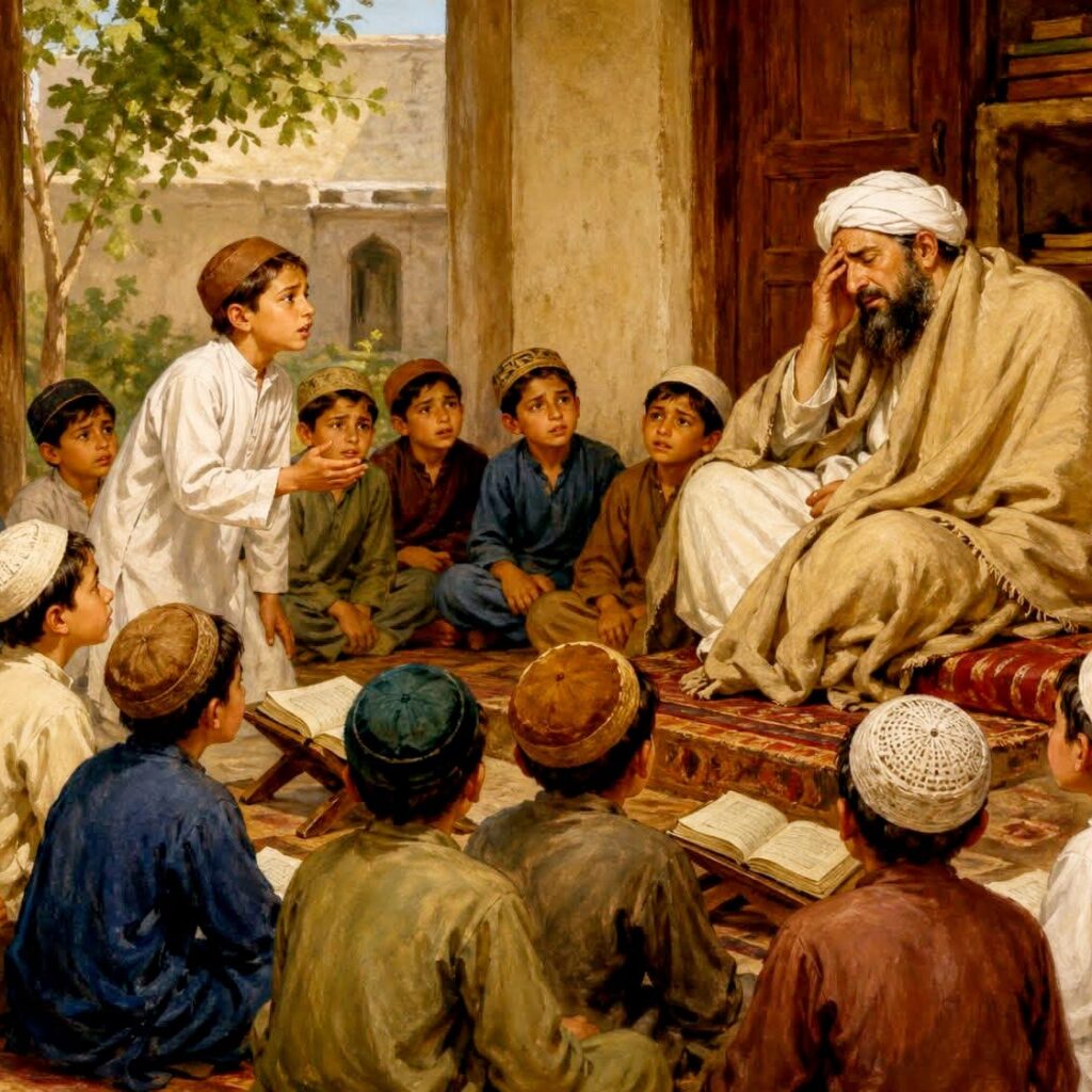 الغرض بچھونا لاکر اس نے بچھا دیا۔ اگر چہ دل میں بہت جل رہی تھی کہ اگر اب میں اس کے خلاف کچھ کہتی ہوں تو بگڑتا ہے اور اگر چپ رہتی ہوں تو یہ ایک مضحکہ ہوا جاتا ہے۔ بہر حال استاد صاحب لیٹ کر کراہنے لگے۔ لڑکے سب وہاں جا بیٹھے اور بہ ظاہر سبق پڑھنے لگے مگر کچھ تو پشیمان تھے کہ یہ بری حرکت ہم سے ہوئی اور کچھ اس فکر میں تھے کہ اب یہاں سے کس طرح چھٹکارا نصیب ہو۔ اس عقل مند لڑکے نے کہا کہ اے بھائیو! خوب خوب پکار پکار کر سبق پڑھو، اور جب سب بچے پکار پکار کر پڑھنے لگے تو اسی لڑکے نے پکار کر کہا کہ ارے بھئی کہیں ہماری آواز سے حضرت کو تکلیف نہ پہنچتی ہو۔ استاد نے بھی کہا ہاں یہ سچ کہتا ہے۔ جاؤ، چھٹی، میرے سر میں درد بڑھ گیا، تم گھروں کو جاؤ، سب لڑکوں نے استاد کو جھک جھک کر سلام کیے اور اچھلتے کودتے اپنے گھر پہنچے جیسے پرندے دانے پر ٹوٹ کر گرتے ہیں۔