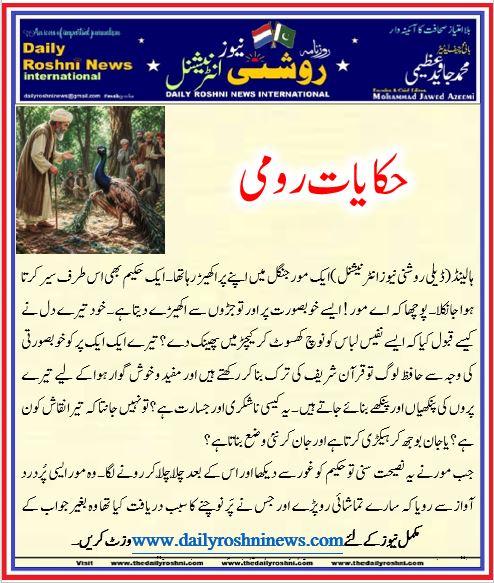 ہالینڈ(ڈیلی روشنی نیوز انٹرنیشنل )ایک مور جنگل میں اپنے پر اکھیڑ رہاتھا۔ ایک حکیم بھی اس طرف سیر کرتا ہوا جانکلا۔ پوچھا کہ اے مور ! ایسے خوبصورت پر اور تو جڑوں سے اکھیڑے دیتا ہے۔ خود تیرے دل نے کیسے قبول کیا کہ ایسے نفیس لباس کو نوچ کھسوٹ کر کیچڑ میں پھینک دے؟ تیرے ایک ایک پر کو خوبصورتی کی وجہ سے حافظ لوگ تو قرآن شریف کی ترک بنا کر رکھتے ہیں اور مفید و خوش گوار ہوا کے لیے تیرے پروں کی پنکھیاں اور پنکھے بنائے جاتے ہیں۔ یہ کیسی ناشکری اور جسارت ہے؟ تو نہیں جانتا کہ تیرا نقاش کون ہے؟ یا جان بوجھ کر ہیکڑی کرتا ہے اور جان کر نئی وضع بناتا ہے؟
