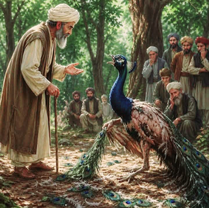 جب مورنے یہ نصیحت سنی تو حکیم کو غور سے دیکھا اور اس کے بعد چلّا چلّا کر رونے لگا۔ وہ مور ایسی پُردرد آواز سے رویا کہ سارے تماشائی رو پڑے اور جس نے پَر نوچنے کا سبب دریافت کیا تھا وہ بغیر جواب کے پشیمان ہوکر دیکھنے لگا کہ میں نے ناحق ہی اس سے پوچھا ،وہ پہلے ہی غم سے بھرا ہوا تھا میں نے اور چھیڑدیا۔ اس کی آنکھوں سے جو آنسو کا قطرہ زمین پر ٹپکتا تھا اس میں سو سو جواب موجود تھے۔ جب رو چکا تو کہا کہ جا تو ابھی رنگ و بو میں گرفتار ہے۔ یہ نہیں دیکھتا کہ ان ہی پروں کے لئے ہر طرف سے سینکڑوں بلاؤں کا نزول مجھ پر ہوتا ہے۔ کتنے بے رحم شکاری ہیں جو ان ہی پروں کی خاطر ہر طرف جال لگائے ہیں اور کتنے تیر انداز ہیں جو ان ہی پروں کے واسطے مجھ پر تیر چلاتے ہیں۔