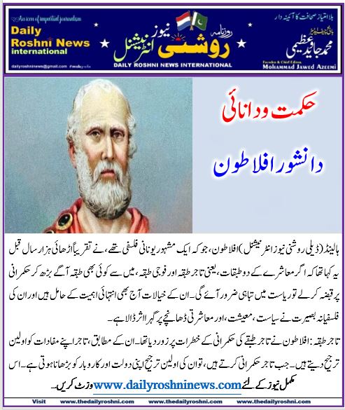 ہالینڈ(ڈیلی روشنی نیوز انٹرنیشنل )افلاطون، جو کہ ایک مشہور یونانی فلسفی تھے، نے تقریباً اڑھائی ہزار سال قبل یہ کہا تھا کہ اگر معاشرے کے دو طبقات، یعنی تاجر طبقہ اور فوجی طبقہ، میں سے کوئی بھی طبقہ آگے بڑھ کر حکمرانی پر قبضہ کر لے تو ریاست میں تباہی ضرور آئے گی۔ ان کے خیالات آج بھی انتہائی اہمیت کے حامل ہیں اور ان کی فلسفیانہ بصیرت نے سیاست، معیشت، اور معاشرتی ڈھانچے پر گہرا اثر ڈالا ہے۔