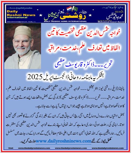 ہالینڈ(ڈیلی روشنی نیوز انٹرنیشنل ۔۔۔ خواجہ شمس الدین عظیمی ؒ شخصیت کا تین الفاظ میں تعارف علم ، خدمت ، مراقبہ۔۔۔ تحریر۔۔۔ڈاکٹر وقار یوسف عظیمی )زندگی کے بعض واقعات ایسے ہوتے ہیں کہ جن کا ہونا لکھا ہوتا ہے انہیں ہونا ہی ہوتا ہے جیسے جو اس دنیا میں آیا ہے اسے جانا ہے۔