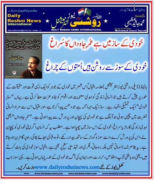 ہالینڈ(ڈیلی روشنی نیوز انٹرنیشنل )علامہ اقبالؒ اس شعر میں خودی کے جوہر کو ایک ایسی قوت اور حقیقت کے طور پر پیش کرتے ہیں جو انسانی زندگی کو ابدی معنویت اور اقوام کو بقا و عزت عطا کرتی ہے۔یہاں “سازِ خودی” ایک تمثیلی اظہار ہے۔ ساز ایک ایسا آلہ ہے جو دھن پیدا کرتا ہے، اور اقبال اس سے مراد انسانی فطرت میں چھپی ہوئی وہ آہنگ ہے جو خودی کی پہچان اور پرورش سے پیدا ہوتی ہے۔”عمرِ جاوداں” یعنی ابدی زندگی کا راز یا سراغ، خودی کے اس ساز میں چھپا ہوا ہے۔ مطلب یہ کہ انسان اگر اپنی خودی کو پہچان لے، اس کی پرورش کرے، اسے سوز و گداز کے ساتھ بیدار رکھے، تو وہ فنا کی بجائے بقا کی راہ پر گامزن ہو جاتا ہے۔ یہ بقا صرف جسمانی نہیں بلکہ روحانی، فکری اور تہذیبی سطح پر بھی ہے۔اقبال سوزِ خودی کی بات کرتے ہیں، یعنی وہ باطنی تڑپ، اخلاص، حرارت، اور ایمان کی آگ جو خودی کے اندر پنہاں ہوتی ہے۔ یہی سوز جب کسی فرد یا قوم میں زندہ ہو تو وہ چراغ بن جاتا ہے جو زمانے کے اندھیروں میں روشنی پھیلاتا ہے۔یہ چراغ اقوام کی زندگی، ان کے کردار، ان کی تہذیب، ان کی قیادت اور ان کے نصب العین کی علامت ہے۔ اقبال کا کہنا ہے کہ جب خودی میں سوز پیدا ہوتا ہے تو وہ پوری امت کو روشنی عطا کرتا ہے، اسے زندہ، بیدار اور فعال بناتا ہے۔اقبال کے نزدیک خودی ایک ایسی الہامی طاقت ہے جو انسان کو مٹی سے اٹھا کر آسمانوں تک لے جا سکتی ہے۔ خودی کے بغیر انسان اور قومیں بے چراغ، بے سمت اور فانی ہیں، لیکن جب خودی بیدار ہو جائے اور اس میں سوز پیدا ہو جائے تو وہ انسان اور اقوام کو جاودانی حیات عطا کرتی ہے۔