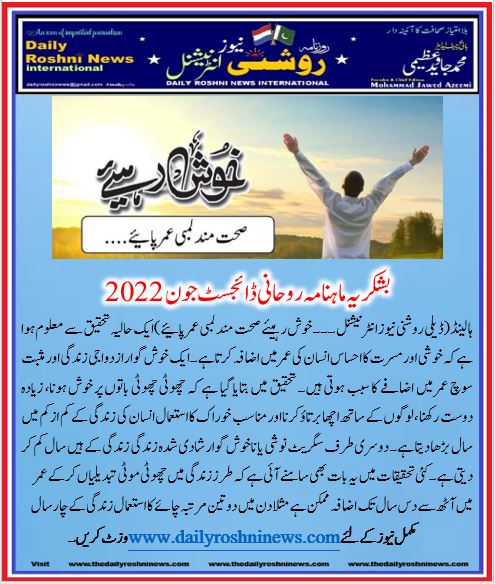 ہالینڈ(ڈیلی روشنی نیوز انٹرنیشنل ۔۔۔ خوش رہیئے صحت مند لمبی عمر پائیے)ایک حالیہ تحقیق سے معلوم ہوا ہے کہ خوشی اور مسرت کا احساس انسان کی عمر میں اضافہ کرتا ہے۔ ایک خوش گوار ازدواجی زندگی اور مثبت سوچ عمر میں اضافے کا سبب ہوتی ہیں۔ تحقیق میں بتایا گیا ہے کہ چھوٹی چھوٹی باتوں پر خوش ہونا، زیادہ دوست رکھنا، لوگوں کے ساتھ اچھا برتاؤ کرنا اور مناسب خوراک کااستعمال انسان کی زندگی کے کم از کم میں سال بڑھا دیتا ہے۔ دوسری طرف سگریٹ نوشی یا ناخوش گوار شادی شدہ زندگی زندگی کے ہیں سال کم کر دیتی ہے۔ کئی تحقیقات میں یہ بات بھی سامنے آئی ہے کہ طرز زندگی میں چھوٹی موٹی تبدیلیاں کر کے عمر میں آٹھ سے دس سال تک اضافہ ممکن ہے مثلا دن میں دو تین مرتبہ چائے کا استعمال زندگی کے چار سال بڑھا سکتا ہے۔ برطانیہ میں عورتوں کی اوسط عمر تقریباً 80 جبکہ مردوں کی اوسط عمر 75 سال ہے، اس تفریق کی ایک بڑی وجہ مردوں اور عورتوں کی عادات اور طرز زندگی کا فرق ہے۔ ماہرین کا کہنا ہے کہ روزانہ دن میں دو کپ چائے اور ایسے پھل کھائیے جن میں اینٹی آکسیڈنٹ اجزاء ہوتے ہیں جیسے سیب کھانے سے عمر میں تقریبا چار سال کا اضافہ ہو سکتا ہے۔