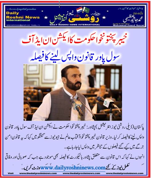 پاکستان(ڈیلی روشنی نیوز انٹرنیشنل )پشاور: خیبرپختونخوا حکومت نے ایکشن ان ایڈ آف سول پاور قانون واپس لینے کا فیصلہ کرلیا۔