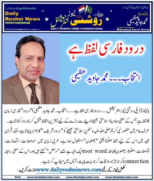 ہالینڈ(ڈیلی روشنی نیوز انٹرنیشنل ۔۔۔ درود فارسی لفظ ہے ۔۔۔ انتخاب ۔ محمد جاوید عظیمی)”درود” فارسی زبان کا لفظ ہے جس کے معنی دعا دینا، سلامتی بھیجنا، اپنے سے بڑے کے لیے بہترین الفاظ منتخب کرنا درود کہلاتا ہے۔