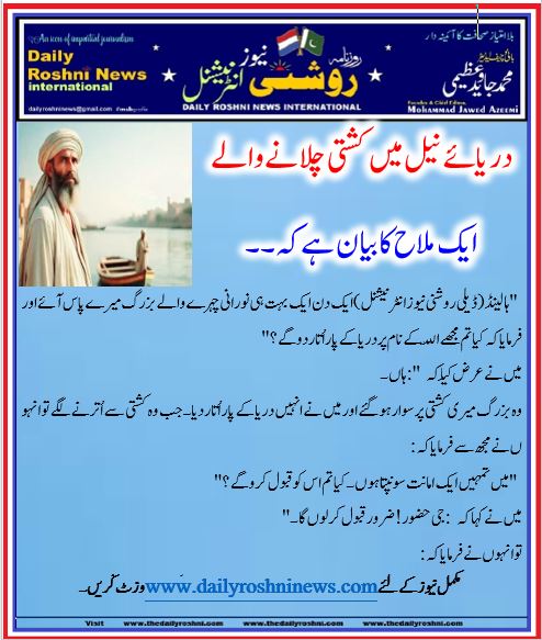 ” ہالینڈ(ڈیلی روشنی نیوز انٹرنیشنل )ایک دن ایک بہت ہی نورانی چہرے والے بزرگ میرے پاس آئے اور فرمایا کہ کیا تم مجھے اللّہ کے نام پر دریا کے پار اُتار دو گے؟ ”