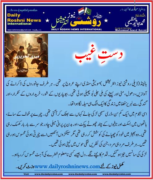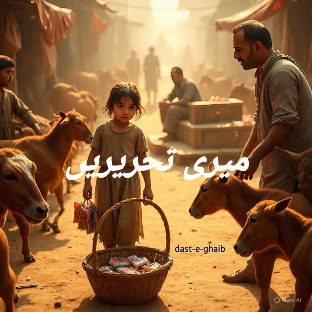 اسی ہجوم میں ایک کم سن، ڈری سہمی لڑکی جانے کہاں سے بھٹک کر آ گئی تھی۔ چہرے پر خوف کے سائے، ہاتھوں میں بسکٹ اور ٹافیوں کے چند چھوٹے پیکٹ، اور بدن پر پرانی میلی چادر جو سر سے بار بار کھسک رہی تھی۔