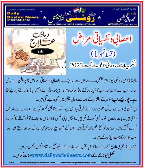ہالینڈ(ڈیلی روشنی نیوز انٹرنیشنل )ڈپریشن : میری ساس سب سے محبت اور سب کا خیال رکھنے والی خاتون ہیں۔ ڈیڑھ سال سے انہیں ہائی بلڈ پر یشر رہنے لگا ہے۔ چھ ماہ پہلے اپنے شوہر کے انتقال کے بعد سے وہ ڈپریشن میں بھی رہنے لگی ہیں۔