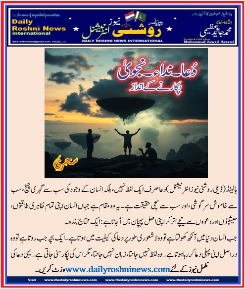 ہالینڈ(ڈیلی روشنی نیوز انٹرنیشنل )دعا صرف ایک لفظ نہیں، بلکہ انسان کے وجود کی سب سے گہری چیخ، سب سے خاموش سرگوشی، اور سب سے سچی حقیقت ہے۔ یہ وہ مقام ہے جہاں انسان اپنی تمام ظاہری طاقتوں، حیثیتوں اور دعووں سے نیچے اتر کر اپنی اصل پہچان میں آ جاتا ہے: ایک محتاج بندہ۔