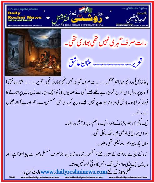 ہالینڈ(ڈیلی روشنی نیوز انٹرنیشنل ۔۔۔ رات صرف گہری نہیں تھی بھاری تھی۔ تحریر ۔۔۔۔۔ عثمان عاشق) آسمان پر بادل اس طرح گرج رہے تھے جیسے کسی نے صدیوں کا دکھ ایک ہی رات میں زمین پر اتارنے کا فیصلہ کر لیا ہو۔ بارش کی ہر بوند چھت پر نہیں، جیسے دل پر گر رہی تھی، مسلسل، بے رحم، اور بے آواز چیخوں کے ساتھ۔