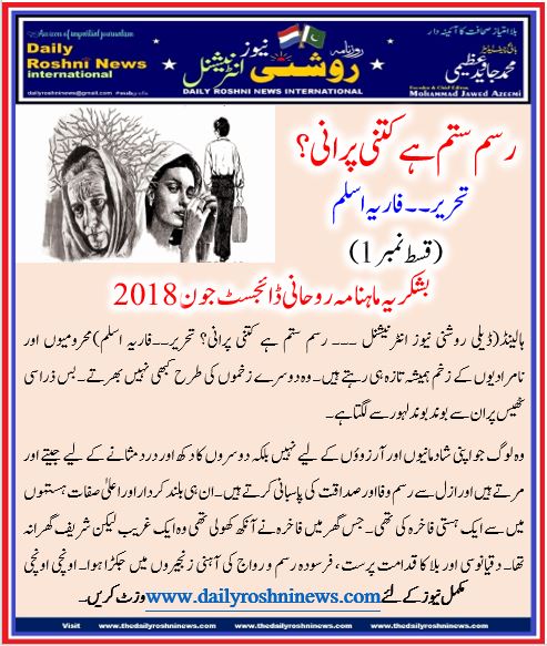 ہالینڈ(ڈیلی روشنی نیوز انٹرنیشنل ۔۔۔ رسم ستم ہے کتنی پرانی؟ تحریر۔۔فاریہ اسلم)محرومیوں اور نامرادیوں کے زخم ہمیشہ تازہ ہی رہتے ہیں۔ وہ دوسرے زخموں کی طرح کبھی نہیں بھرتے۔ بس ذرا سی ٹھیس پر ان سے بوند بوند لہور سے لگتا ہے۔