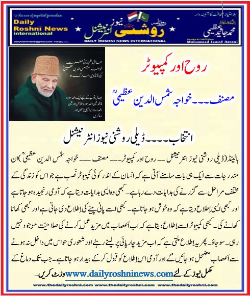 ہالینڈ(ڈیلی روشنی نیوز انٹرنیشنل ۔۔ روح اور کمپیوٹر۔۔۔ مصنف ۔۔۔ خواجہ شمس الدین عظیمیؒ )ان مندرجات سے ایک ہی بات سامنے آتی ہے کہ انسان کے اندر کوئی کمپیوٹر نَصب ہے جو اس کو زندگی کے مختلف مراحل سے گزرنے کی ہدایات دے رہا ہے۔ کبھی وہ ایسی ہدایات دیتا ہے کہ آدمی رنجیدہ ہو جاتا ہے اور کبھی ایسی اِطلاع دیتا ہے کہ وہ خوش ہو جاتا ہے۔ کبھی اسے پانی پینے کی اِطلاع دی جاتی ہے اور کبھی کھانا کھانے کی۔ کبھی کمپیوٹر اسے اِطلاع دیتا ہے کہ اب اَعصاب میں مزید عمَل کرنے کی صلاحیّت مَوجود نہیں رہی۔ سو جاؤ۔ پھر یہ اِطلاع ملتی ہے کہ اب مزید چارپائی پر لیٹے رہنے اور شعوری حواس میں داخل نہ ہونے سے اَعصاب مضمحل ہو جائیں گے اور آدمی اس اِطلاع کو قبول کرکے بیدار ہو جاتا ہے۔ جب تک دماغ کے اندر نصب شدہ کمپیوٹر کوئی اِطلاع نہیں دیتا، آدمی یا کوئی بھی ذی روح کوئی کام نہیں کر سکتا۔ اس میں انسان، بھیڑ، بکری، کسی جانور، نباتات و جمادات کی کوئی قید نہیں ہے۔ سب کے اندر یہ اِطلاع دینے والی مشین نصب ہے۔ یہ مشین وہی اِطلاع فراہم کرتی ہے جس کی ضرورت ہوتی ہے۔
