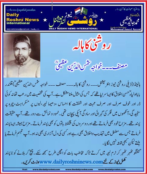 ہالینڈ(ڈیلی روشنی نیوز انٹرنیشنل )قلندر بابااولیاءؒ حسن اخلاق کا ایسا سراپا تھے کہ جس کی مثال ملنا مشکل ہے۔آپ کی شخصیت میں رعب تھا نہ کوئی ڈر اور خوف صرف اور صرف محبت اور شفقت کا احساس ،دھیما لہجہ،لبوں پر مسکراہٹ،چہرہ پر سنجیدگی،آنکھوں میں فکر کی گہرائی اور سادگی آپکی پہچان تھی۔نمود و نمائش سے دور تھے۔آپ حقیقت پسند تھے۔مزاح خود بھی فرماتے تھے اور دوسروں کی شگفتہ باتوں کو بھی پسند فرماتے۔ مزاح ہمیشہ ایسا پسند فرماتے جس سے مضفل میں تہذیب و اخلاق بھی رہے اور کسی کی دل آزاری بھی نہ ہو۔آپ تبسم فرماتے یا ہنستے لیکن کبھی قہقہ نہیں لگایا۔