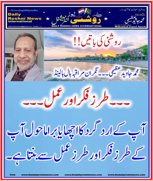 روشنی کی باتیں۔۔محمد جاوید عظیمی۔۔۔ نگران مراقبہ ہال ہالینڈ / ہالینڈ کی خبریں, اقوال زریں / By Daily Roshni News روشنی کی باتیں محمد جاوید عظیمی۔۔۔ نگران مراقبہ ہال ہالینڈ ۔۔۔ طرز فکر اور عمل۔۔۔ آپ کے ارد گرد کا اچھا یا برا ماحول آپ کے طرز فکر اور طرز عمل سے بنتا ہے ۔