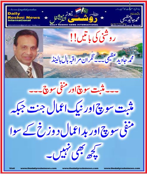 مثبت سوچ اور نیک اعمال جنت جبکہ منفی سوچ اور بد اعمال دوزخ کے سوا کچھ بھی نہیں۔