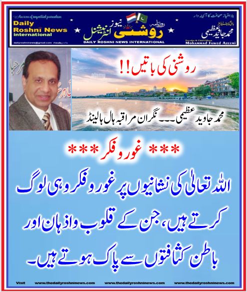 روشنی کی باتیں۔۔۔محمد جاوید عظیمی۔۔۔ نگران مراقبہ ہال ہالینڈ / ہالینڈ کی خبریں, متفرق نگارشات / By Daily Roshni News روشنی کی باتیں محمد جاوید عظیمی۔۔۔ نگران مراقبہ ہال ہالینڈ غور و فکر اللہ تعالیٰ کی نشانیوں پر غور و فکر و ہی لوگ کرتے ہیں، جن کے قلوب و اذہان اور باطن کثافتوں سے پاک ہوتے ہیں۔