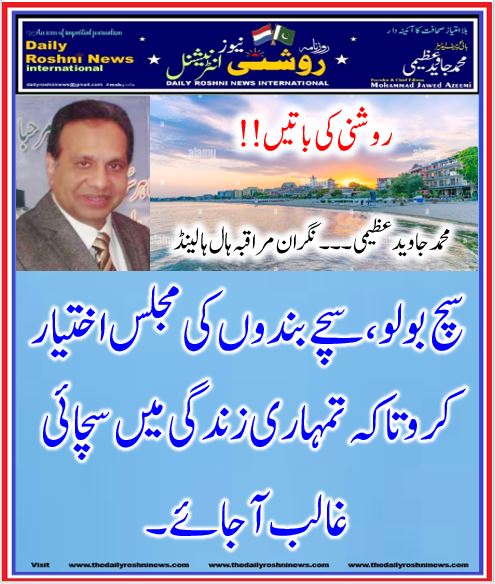 روشنی کی باتیں۔۔۔محمد جاوید عظیمی۔۔۔ نگران مراقبہ ہال ہالینڈ / ہالینڈ کی خبریں, متفرق نگارشات / By Daily Roshni News روشنی کی باتیں محمد جاوید عظیمی۔۔۔ نگران مراقبہ ہال ہالینڈ سچ بولو ، سچے بندوں کی مجلس اختیار کرو تاکہ تمہاری زندگی میں سچائی غالب آ جائے ۔