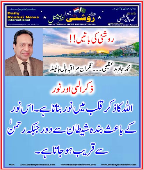 روشنی کی باتیں ۔۔۔محمد جاوید عظیمی۔۔۔ نگران مراقبہ ہال ہالینڈ / ہالینڈ کی خبریں, اقوال زریں / By Daily Roshni News روشنی کی باتیں محمد جاوید عظیمی۔۔۔ نگران مراقبہ ہال ہالینڈ ذکر الہی اور نور اللہ کا ذکر قلب میں نور بناتا ہے۔ اس نور کے باعث بندہ شیطان سے دور جبکہ رحمنٰ سے قریب ہو جاتا ہے۔