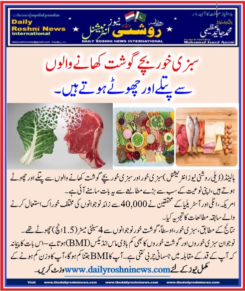 ہالینڈ(ڈیلی روشنی نیوز انٹرنیشنل )سبزی خور اور سبزی خور بچے گوشت کھانے والوں سے پتلے اور چھوٹے ہوتے ہیں، اپنی نوعیت کے سب سے بڑے مطالعے سے یہ بات سامنے آئی ہے۔