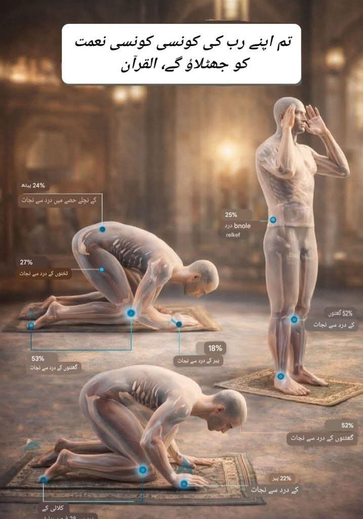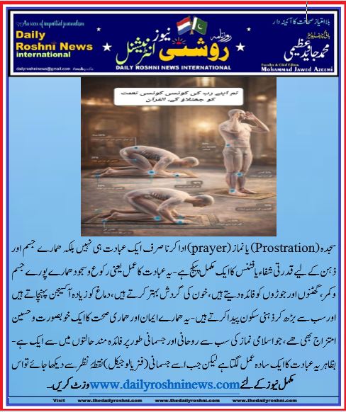 ہالینڈ(ڈیلی روشنی نیوز انٹرنیشنل )سجدہ یا نماز ادا کرنا صرف ایک عبادت ہی نہیں بلکہ ھمارے جسم اور ذہن کے لیے قدرتی شفاء یا فٹنس کا ایک مکمل پیکج ہے- یہ عبادت کا عمل یعنی رکوع و سجود ھمارے پورے جسم و کمر، گھٹنوں اور جوڑوں کو فائدہ دیتے ہیں، خون کی گردش بہتر کرتے ہیں، دماغ کو زیادہ آکسیجن پہنچاتے ہیں اور سب سے بڑھ کر ذہنی سکون پیدا کرتے ہیں- یہ ھمارے ایمان اور ھماری صحت کا ایک خوبصورت و حسین امتزاج بھی ھے، جو اسلامی نماز کی سب سے روحانی اور جسمانی طور پر فائدہ مند حالتوں میں سے ایک ہے- بظاہر یہ عبادت کا ایک سادہ عمل لگتا ہے لیکن جب اسے جسمانی (فزیالوجیکل) نقطۂ نظر سے دیکھا جائے تو اس میں پٹھوں، جوڑوں، خون کی گردش اور ہڈیوں کی حرکت کا ایک حیرت انگیز امتزاج سامنے آتا ہے-