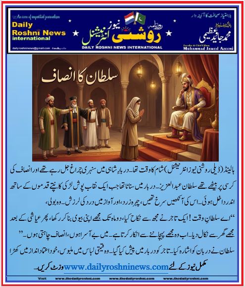 ہالینڈ(ڈیلی روشنی نیوز انٹرنیشنل )شام کا وقت تھا۔ دربارِ شاہی میں سنہری چراغ جل رہے تھے اور انصاف کی کرسی پر بیٹھے تھے سلطان عبدالعزیز۔ دربار میں سناٹا تھا جب ایک نقاب پوش لڑکی کانپتے قدموں کے ساتھ اندر داخل ہوئی۔ اس کی آنکھیں سرخ تھیں، چہرہ زرد، اور آواز میں درد کی لرزش۔