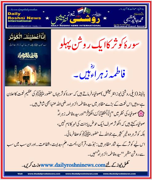 ہالینڈ(ڈیلی روشنی نیوز انٹرنیشنل )صوفیاء فرماتے ہیں کہ سورۂ کوثر جہاں حضور ﷺ کی عظیم نعمت کا اعلان ہے، وہیں اس نعمت کے بڑے مظاہر میں سیدہ فاطمہ الزہراء رضی اللہ عنہا بھی شامل ہیں۔