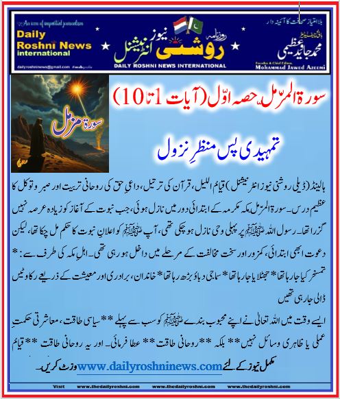 ہالینڈ(ڈیلی روشنی نیوز انٹرنیشنل )قیامُ اللیل، قرآن کی ترتیل، داعیِ حق کی روحانی تربیت اور صبر و توکل کا عظیم درس۔سورۃ المزّمّل مکہ مکرمہ کے ابتدائی دور میں نازل ہوئی، جب نبوت کے آغاز کو زیادہ عرصہ نہیں گزرا تھا۔ رسول اللہ ﷺ پر پہلی وحی نازل ہو چکی تھی، آپ ﷺ کو اعلانِ نبوت کا حکم مل چکا تھا، لیکن دعوت ابھی ابتدائی، کمزور اور سخت مخالفت کے مرحلے میں داخل ہو رہی تھی۔ اہلِ مکہ کی طرف سے: * تمسخر کیا جا رہا تھا * جھٹلایا جا رہا تھا * سماجی دباؤ بڑھ رہا تھا * خاندان، برادری اور معیشت کے ذریعے رکاوٹیں ڈالی جا رہی تھیں