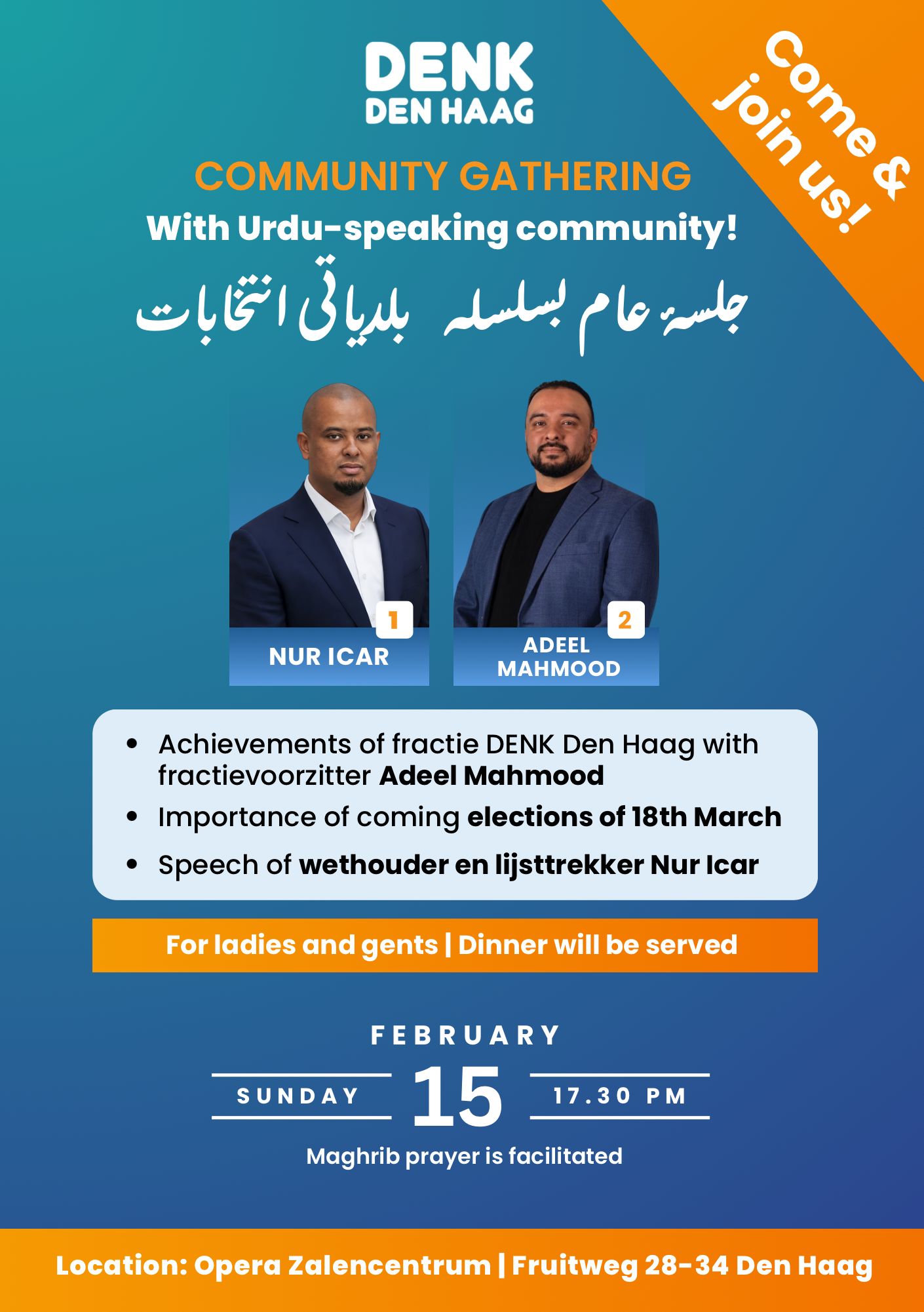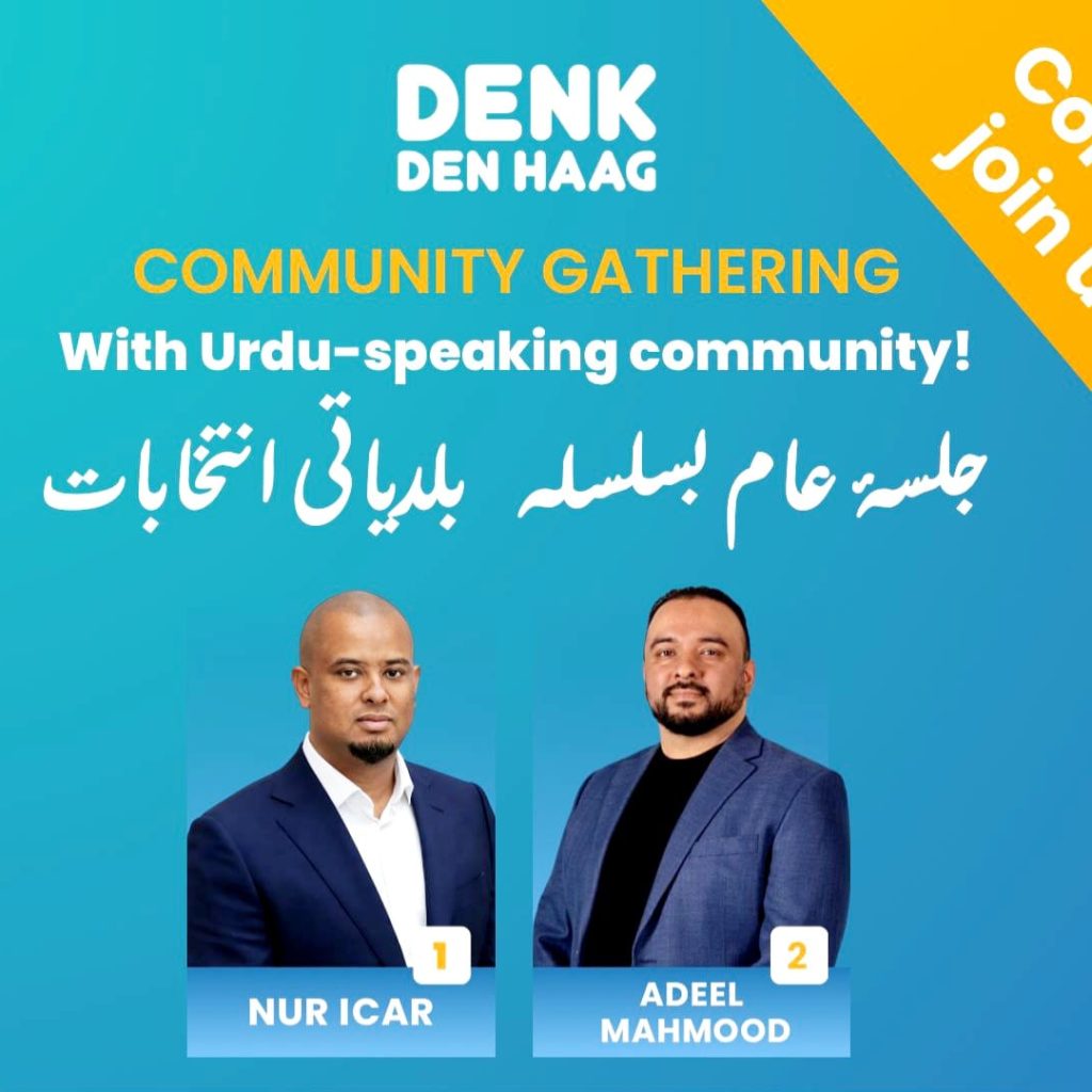 ڈینک کے بلدیاتی امیدوار عدیل محمود سے یکجہتی کا اظہار کرنے کے لئے جلسہ عام منعقد کیا جا رہا ہے۔ مذکورہ جلسے میں کمیونٹی کے خواتین و حضرات اور نوجوانوں کو شرکت کے لئے دعوت خاص دی جاتی ہے. ذرائع کے مطابق ہال میں نماز مغرب کی ادائیگی کے لئے سہولت فراہم کی جائے گی جبکہ جلسہ عام کے اختتام پر  لذت کام و دہن کے سلسلے میں شرکا کی تواضع پاکستانی کھانوں سے کی جائے گی۔ وقت کی پابندی کو  ملحوظ خاطر رکھیں ۔ یا د ر ہے عدیل محمود دی ہیگ کی معروف سماجی اور مذہبی شخصیت چوہدری خالد محمود کے صاحبزادے ہیں۔ عدیل محمود اس سے  قبل بھی متعدد بار بلدیاتی انتخابات میں حصہ لے چکے ہیں۔ متذکرہ جلسہ عام سے متعلق مزید معلومات کے لئے خبر کے شائع شدہ پوسٹر کا مطالعہ ضرور کریں۔