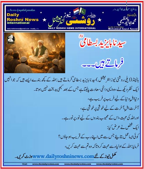 ہالینڈ(ڈیلی روشنی نیوز انٹرنیشنل )سیدنا بایزید بسطامیؒ فرماتے ہیں:اللہ کے کچھ بندے ایسے ہیں کہ جو انہیں ایک نظر دیکھ لے، وہ ایسی دائمی سعادت پا لیتا ہے جس کے بعد کبھی بدبخت نہیں ہوتا۔