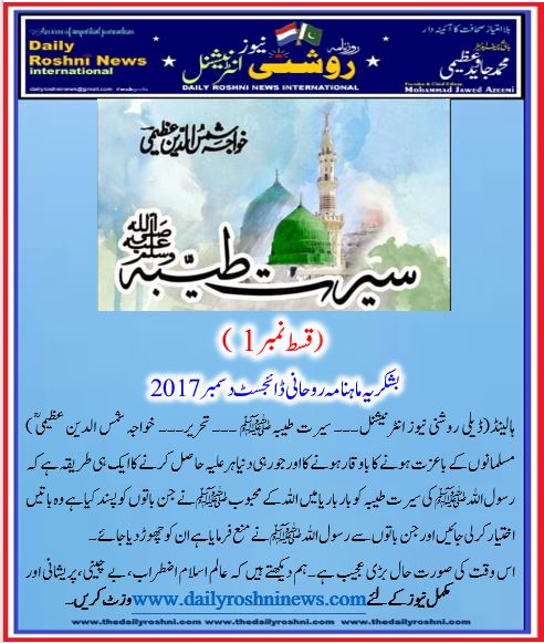 ہالینڈ(ڈیلی روشنی نیوز انٹرنیشنل۔۔۔ سیرت طیبہﷺ ۔۔۔ تحریر۔۔۔ خواجہ شمس الدین عظیمیؒ )مسلمانوں کے باعزت ہونے کا باوقار ہونے کا اور جو رہی دنیا ہر علیہ حاصل کرنے کا ایک ہی طریقہ ہے کہ رسول اللہ ﷺ کی سیرت طیبہ کو بار بار یا میں اللہ کے محبوب ﷺ نے جن باتوں کو پسند کیا ہے وہ باتیں اختیار کرلی جائیں اور جن باتوں سے رسول اللہ ﷺ نے منع فرمایا ہے ان کو چھوڑ دیا جائے۔