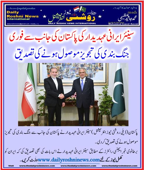 پاکستان(ڈیلی روشنی نیوز انٹرنیشنل )سینئر ایرانی عہدیدار نے پاکستان کی جانب سے جنگ بندی کی تجویز موصول ہونے کی تصدیق کر دی۔