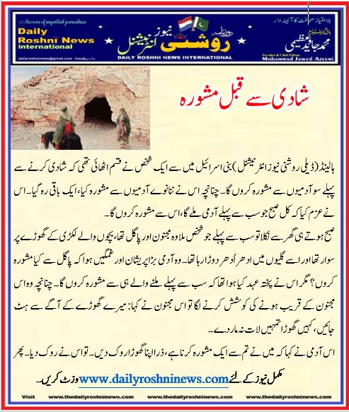 ہالینڈ(ڈیلی روشنی نیوز انٹرنیشنل )بنی اسرائیل میں سے ایک شخص نے قسم اٹھائی تھی کہ شادی کرنے سے پہلے سو آدمیوں سے مشورہ کروں گا۔ چنانچہ اس نے ننانوے آدمیوں سے مشورہ کیا، ایک باقی رہ گیا۔ اس نے عزم کیا کہ کل صبح جو سب سے پہلے آدمی ملے گا، اس سے مشورہ کروں گا۔
