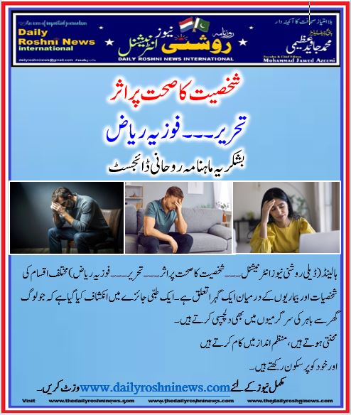 ہالینڈ(ڈیلی روشنی نیوز انٹرنیشنل ۔۔۔ شخصیت کا صحت پر اثر۔۔۔ تحریر۔۔۔فوزیہ ریاض)مختلف اقسام کی شخصیات اور بیماریوں کے درمیان ایک گہرا تعلق ہے۔ ایک طبی جائزے میں انکشاف کیا گیا ہے کہ جو لوگ