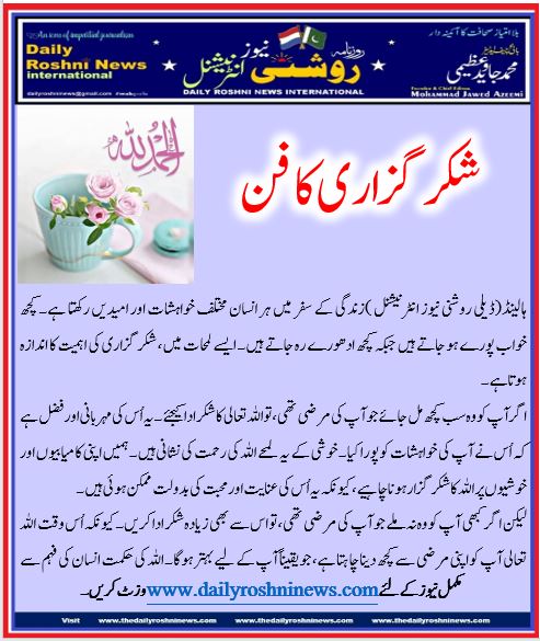 ہالینڈ(ڈیلی روشنی نیوز انٹرنیشنل )زندگی کے سفر میں ہر انسان مختلف خواہشات اور امیدیں رکھتا ہے۔ کچھ خواب پورے ہو جاتے ہیں جبکہ کچھ ادھورے رہ جاتے ہیں۔ ایسے لمحات میں، شکرگزاری کی اہمیت کا اندازہ ہوتا ہے۔