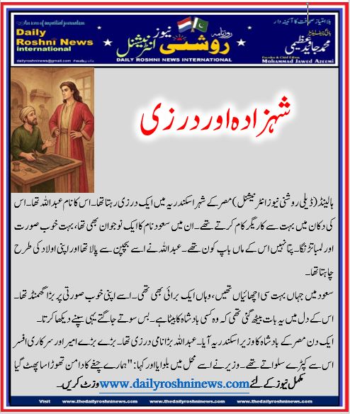 ہالینڈ(ڈیلی روشنی نیوز انٹرنیشنل )مصر کے شہر اسکندریہ میں ایک درزی رہتا تھا۔ اس کا نام عبداللہ تھا۔ اس کی دکان میں بہت سے کاریگر کام کرتے تھے۔ ان میں سعود نام کا ایک نوجوان بھی تھا، بہت خوب صورت اور لمبا تڑنگا۔ پتا نہیں اس کے ماں باپ کون تھے۔ عبداللہ نے اسے بچپن سے پالا تھا اور اپنی اولاد کی طرح چاہتا تھا۔