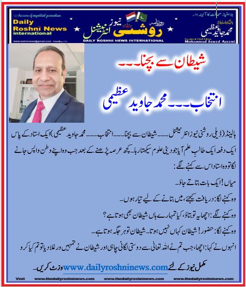 ہالینڈ(ڈیلی روشنی نیوز انٹرنیشنل۔۔۔ شیطان سے بچنا ۔۔۔ انتخاب ۔۔۔محمد جاوید عظیمی)ایک استاد کے پاس ایک دفعہ ایک طالبِ علم آیا جو دینی علوم سیکھتا رہا۔ کچھ عرصہ پڑھنے کے بعد جب وہ اپنے وطن واپس جانے لگا تو وہ استاد اس سے کہنے لگے: