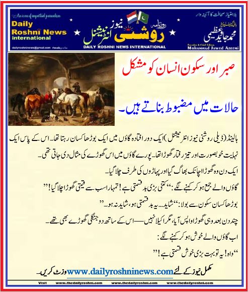 ہالینڈ(ڈیلی روشنی نیوز انٹرنیشنل )ایک دور افتادہ گاؤں میں ایک بوڑھا کسان رہتا تھا۔ اس کے پاس ایک نہایت خوبصورت اور تیز رفتار گھوڑا تھا۔ پورے گاؤں میں اس گھوڑے کی مثال دی جاتی تھی۔
