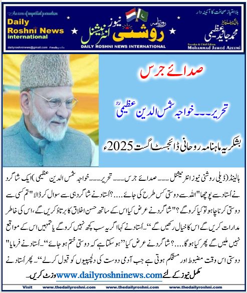 ہالینڈ(ڈیلی روشنی نیوز انٹرنیشنل ۔۔۔ صدائے جرس۔۔۔ تحریر۔۔۔خواجہ شمس الدین عظیمی )ایک شاگرد نے اُستاد سے پوچھا ” اللہ سے دوستی کس طرح کی جائے …. ؟اُستاد نے شاگر دہی سے سوال کر ڈالا ” تم کسی سے دوستی کرنا چا ہو تو کیا کرو گے؟” شاگرد نے عرض کیا اس کے ساتھ حسن اخلاق کا برتاؤ کریں گے، اس کی خاطر مدارات کریں گے اس کا خیال رکھیں گے “۔ اُستاد نے کہا اگر یہ سب کچھ نہیں کرو گے یا تمہیں اس کے مواقع نہیں ملیں گے پھر کیا ہو گا….؟ شاگرد نے عرض کیا ” ہو سکتا ہے کہ دوستی ختم ہو جائے“۔ اُستاد نے فرمایا ” دوستی اس وقت مضبوط اور مستحکم ہوتی ہے جب آدمی دوست کی دلچسپیوں کو قبول کرلے“۔ پھر اُستاد نے شاگرد سے سوال کیا کہ اللہ تعالی کیا کرتے ہیں ؟“ شاگرد نے اپنی عقل اور تجربے کے مطابق بہت ساری باتیں کیں ۔ استاد نے قطع کلام کرتے ہوئے فرمایا ” مختصر بات یہ ہے کہ اللہ اپنی مخلوق کے لیے وسائل تخلیق کرتا ہے اور بغیر کسی غرض کے مخلوق کی ضرورت کے تمام وسائل مخلوق کو مفت فراہم کرتا ہے۔ لہذا اللہ سے اگر دوستی کرنی ہے تو مخلوق کی بھلائی کے کام ستائش اور انعام کی توقع کے بغیر کرو“۔ استاد نے مزید تشریح فرماتے ہوئے پوچھا زمین کی کیا ڈیوٹی ہے….؟ شاگرد نے عرض کیا زمین پر کھیتیاں لہلہاتی ہیں ۔ زمین درخت اگاتی ہے ۔ درختوں پر پھل لگتے ہیں۔ زمین انسان کو خوش کرنے کے لیے پھولوں میں رنگ آمیزی کرتی ہے “۔ اُستاد نے سوال کیا گائے اور زمین کا کیا رشتہ ہے ….؟” شاگرد نے عرض کیا گائے زمین پر گھاس چرتی ہے”۔