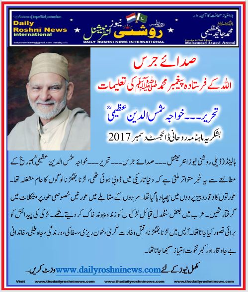 ہالینڈ(ڈیلی روشنی نیوز انٹرنیشنل ۔۔۔ صدائے جرس۔۔۔ تحریر۔۔۔خواجہ شمس الدین عظیمی ؒ)تاریخ کے مطالعے سے یہ خبر متواتر ملتی ہے کہ دنیا تاریکی میں ڈوبی ہوئی تھی، لڑنا جھگڑنا لوگوں کا عام مشغلہ تھا۔ عورتوں کا وقار دبیز پردوں میں چھپا دیا گیا تھا۔ مردوں کے مقابلے میں عورتیں خصوصی طور پر مشکلات میں گرفتار تھیں۔ عرب میں بعض سنگدل قبائل لڑکیوں کو زندہ پیوند خاک کر دیتے تھے۔ لڑکی کی پیدائش کو برائی تصور کیا جاتا تھا۔ آپس میں لڑنا جھگڑنا، قتل وغارت گری، خون ریزی، سفاکی، درندگی، جاه طلبی، خاندانی بے جاوقار اور کبر نخوت امتیاز سمجھا جاتا تھا۔